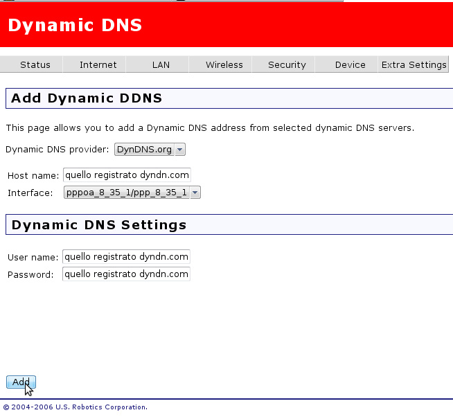 Entrate nella funzione dynamic dns del vostro router, e cliccate su "add" ; "aggiungi"...insomma avete capito. Vi dovrebbe compartire la schermata per inserire i dati ...Nel mio caso: